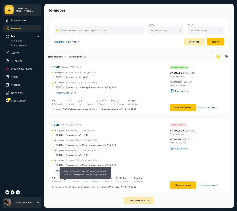 С сегодняшнего дня для транспортных компаний в личном кабинете платформы «Облачная логистика» доступен обновленный «Список тендеров».