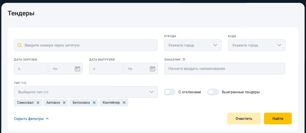 Сократили поля и фильтры в поле поиска, оставив только самые основные параметры, для быстрого заполнения и поиска нужного тендера.